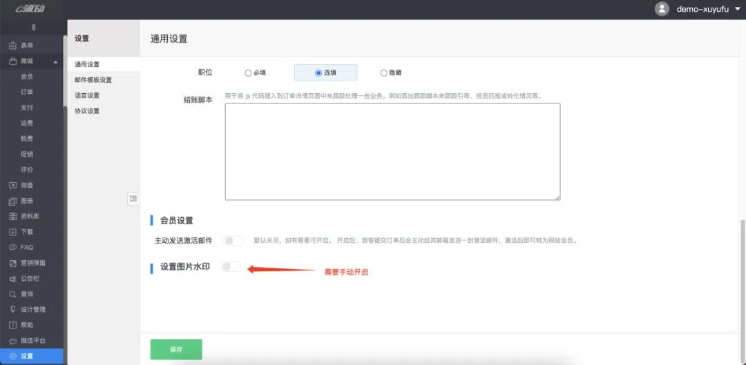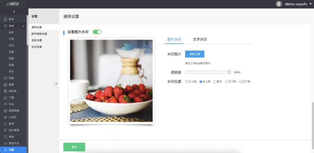 在内容管理后台的通用设置中,新增“设置图片水印”设置项,支持图片水印、文字水印两种水印模式。